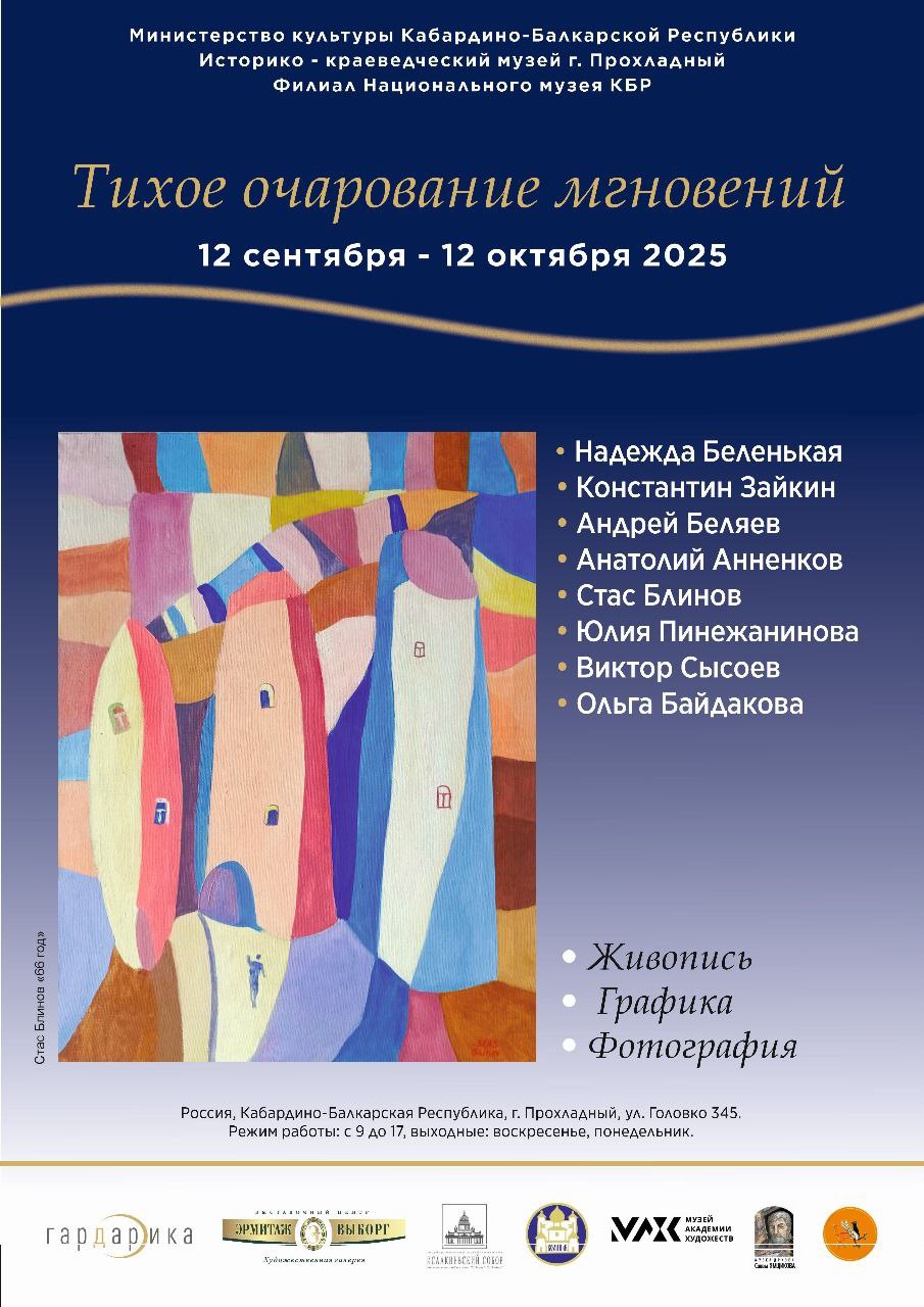 Историко-краеведческий музей города Прохладный ул. Головко, 351, Прохладный12 сентября 2025 года в обновлённом зале Историко-краеведческого музея города Прохладный состоялось знаковое культурное событие — в рамках Арт-фестиваля «Гардарика Кавказ» торжественно открылась выставка петербургских художников «Тихое очарование мгновений». Экспозиция, объединившая живопись и фотоискусство, стала настоящим мостом между северной столицей России и солнечной Кабардино-Балкарией. Восемь мастеров из Санкт-Петербурга привезли свои работы, чтобы поделиться со зрителем… Подробнее »Выставка петербургских художников «Тихое очарование мгновений»